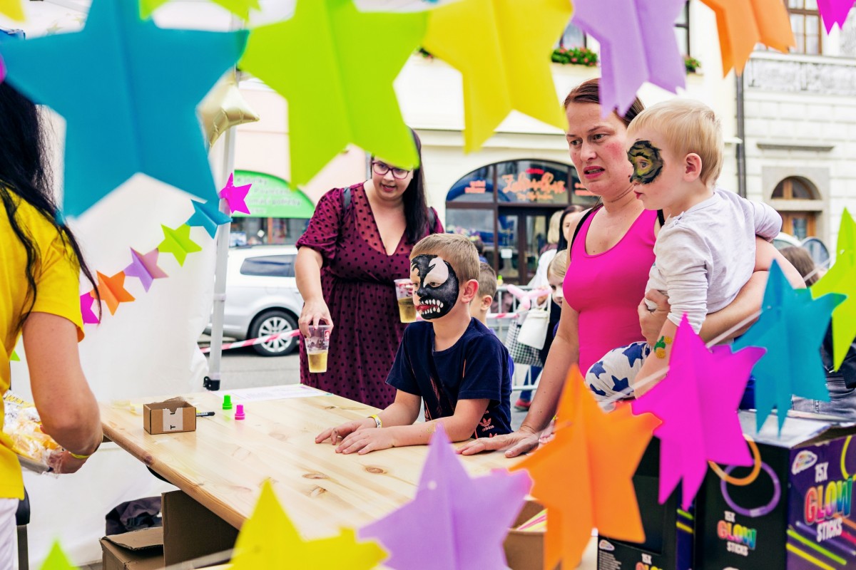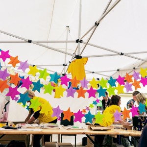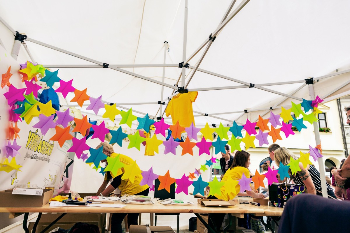 Významným prvkem pro snazší a jasnou orientaci návštěvníků bylo sestavení orientační mapy a plánku zábavného odpoledne. Zároveň jsme se postarali o branding celé plochy náměstí včetně většiny stanů zastřešujících atrakce. Třpytivé hvězdičky zdobily jídelní stoly, hvězdné balonky stan s odměnami a další stovky neonových hvězd bylo vidět všude a na všem.